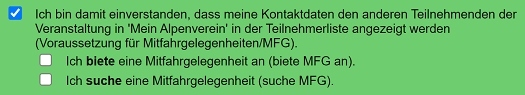 Darunter kannst du zusätzlich angeben, ob du eine Mitfahrgelegenheit zu dieser Tour anbieten möchtest und/oder eine Mitfahrgelegenheit suchst.