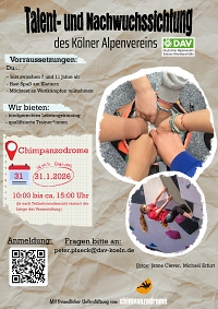 Die Talentsichtung findet am Samstag, den 31.01.2026 um 10 Uhr in der Kletterhalle Chimpanzodrome statt. Die offizielle Begrüßung und Beginn ist um 10:30 Uhr in Sportbekleidung (inkl. Turnschuhe) im Bistro auf der ersten Etage. Zu Beginn werden wir uns gemeinsam erwärmen. Anschließend geht es in Gruppen in die Kletterrouten und Boulder. Jedes Kind hat die Möglichkeit zwei verschiedene, vorgegebene Routen und drei Boulder zu klettern. Einen kleinen Speed Test machen wir auch. Gegen Nachmittag um ca. 15:00 Uhr sollen wir mit dem Programm fertig sein. Danach werden wir die Endergebnisse bekannt geben und jedes Kind bekommt eine Urkunde.
