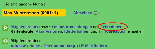 Logge dich dafür ins Mitgliederportal Mein Alpenverein ein. Unter "Teilnahmen" findest du die Liste der Touren, an denen du teilnimmst.