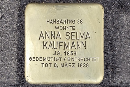 Selma Kaufmann war mit dem Karnevalisten Carl Nussbaum befreundet, dieser schickte ihr 1917 eine Feldpostkarte in den Hansaring 38. Selma taucht bis 1930 in den Adressbüchern unter Hansaring 38 auf, danach ist sie nicht mehr zu finden. Selma starb laut ihrer Sterbeurkunde unverheiratet am 08.03.1939 im Alter von 79 Jahren in ihrer Wohnung in der Spichernstraße 24.